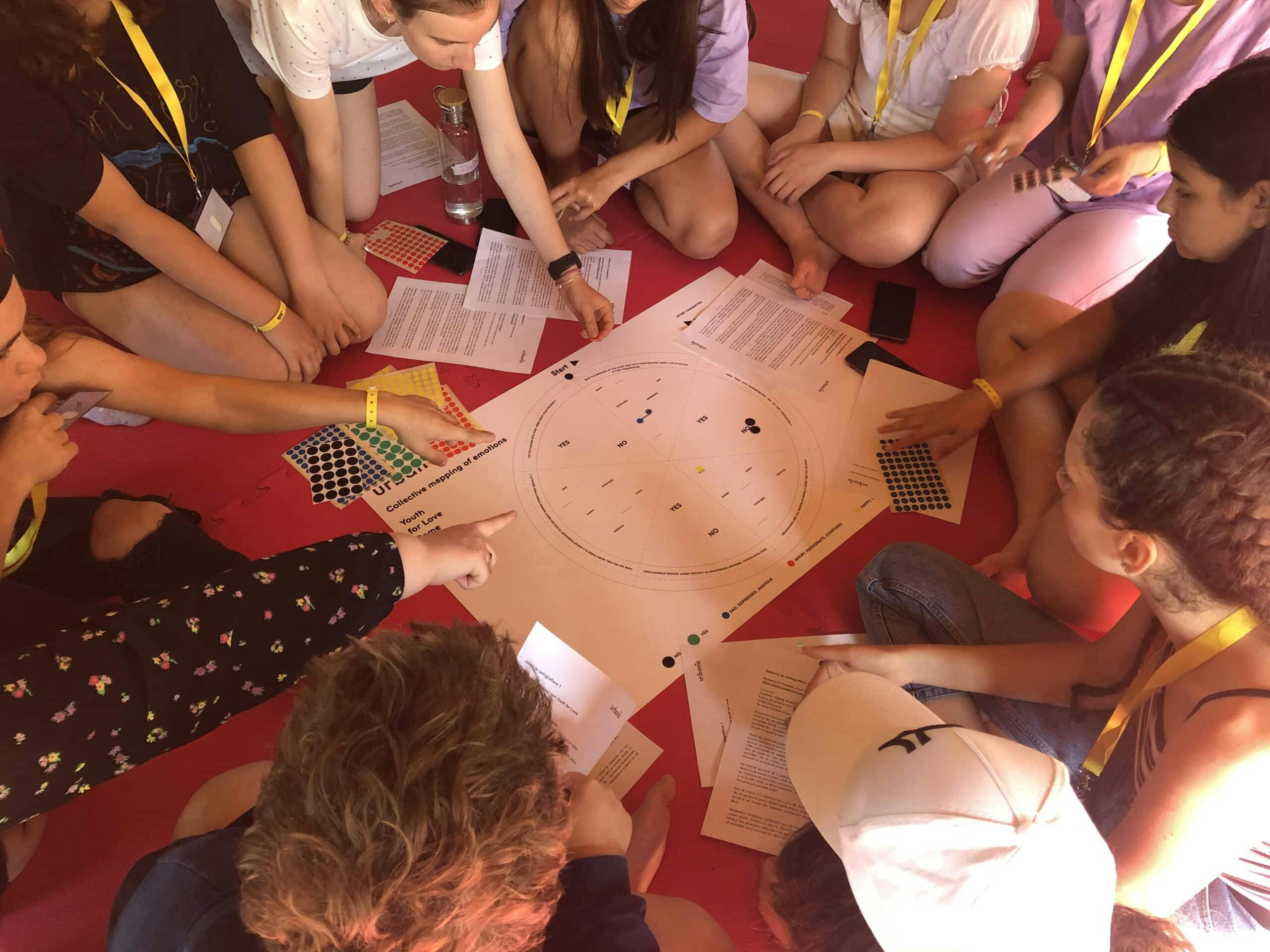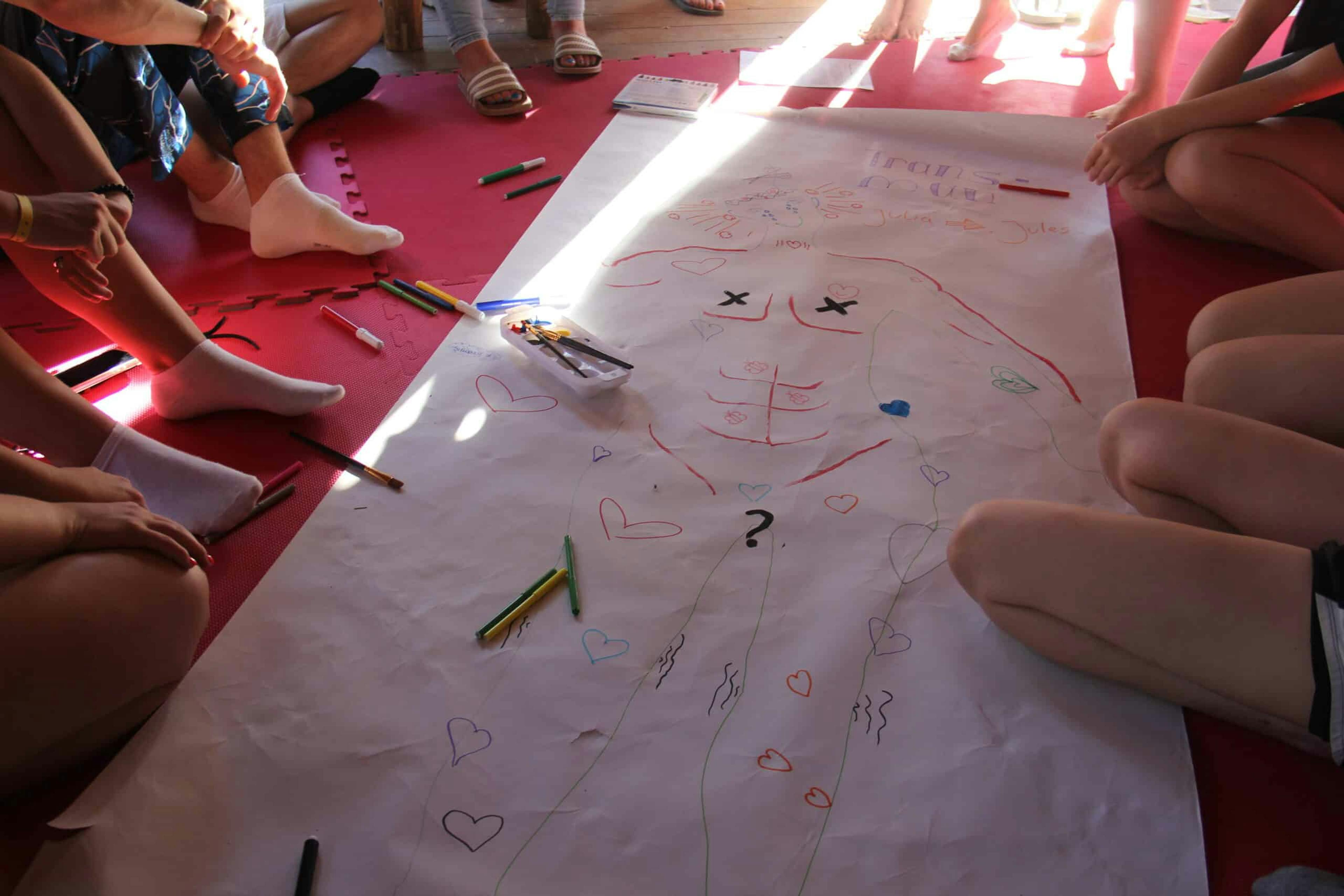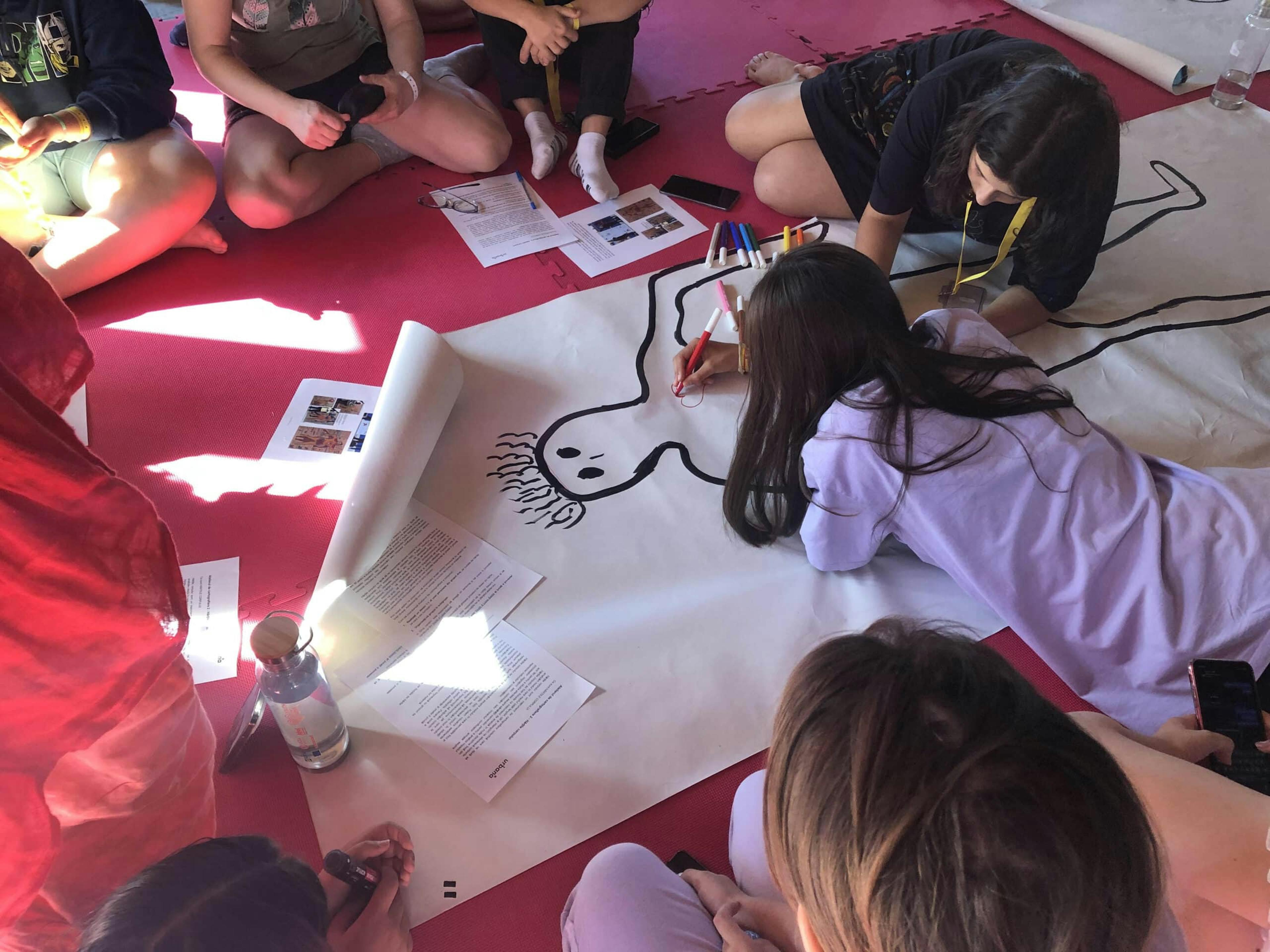 During the workshop, teenagers from Italy, Belgium, Romania, and Greece engaged deeply with the mapping techniques. Through the process, they brought forward everyday gender issues, particularly those experienced during adolescence, and spoke openly about gender identity and bodily experiences, including menstruation.
