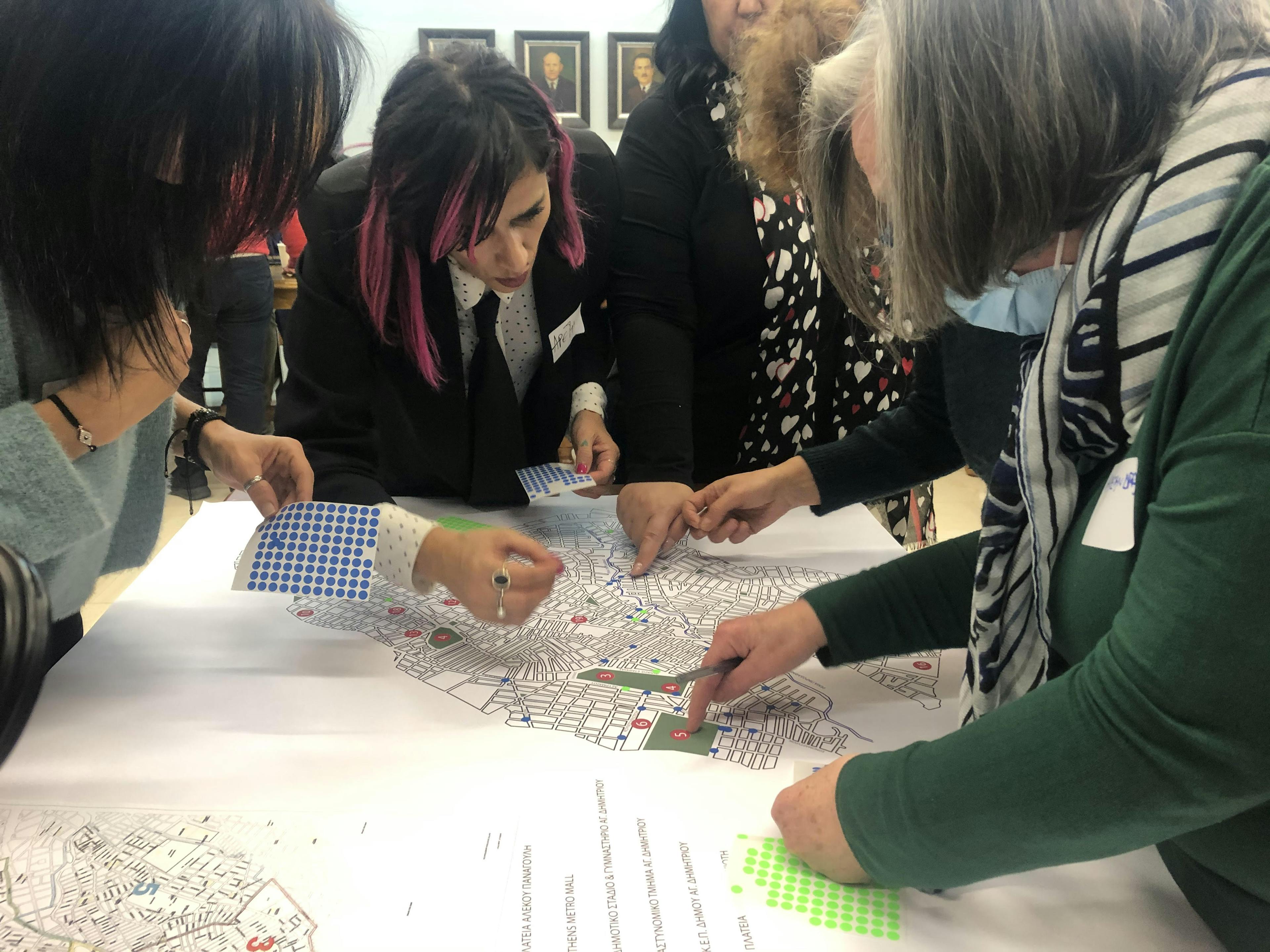 Within the framework of the action "Women Visible in the City", we worked in the city of Agios Dimitrios, where we facilitated 3 participatory workshops on experiential mapping together with residents and members of the municipality. Putting on our gender lenses, we walked through neighbourhoods, observed recent changes in public space, and documented what is still needed to make the city safer and more accessible for all.